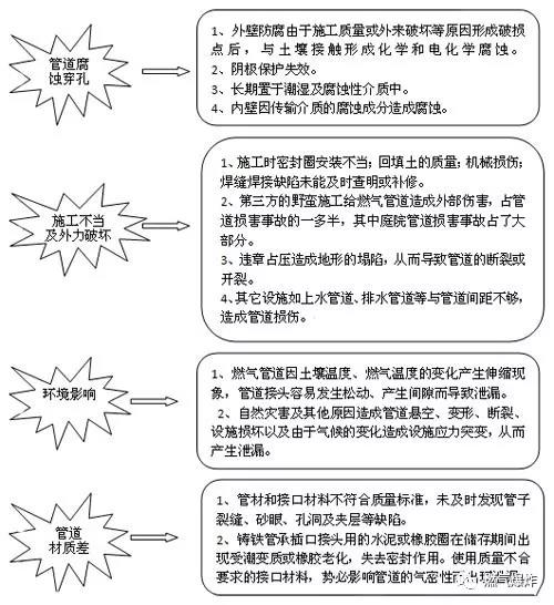 燃气管道投入运行后,因腐蚀、管道接口、密封材料老化、安装质量不良、机械振动、管道的热胀冷缩等原因,产生穿孔、裂缝或断裂造成燃气泄漏。燃气泄漏以后,会沿着一定的通道传播到地面或建构筑物内,当泄漏的燃气达到爆炸极限,遇火源则产生火灾、爆炸和一系列次生灾害,导致严重的人员伤亡和财产损失。