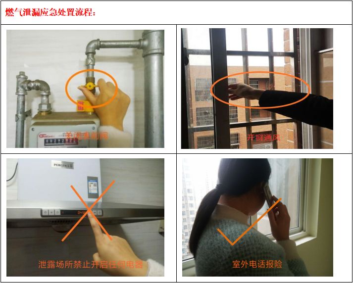 (3)一旦发现泄漏,首先要稳定情绪、不要慌张,应轻手关闭表前阀或室内燃气总阀,并将门窗打开,过程中严禁明火、启闭任何电器或打电话,然后到户外安全地点拨打燃气24小时服务热线报险。