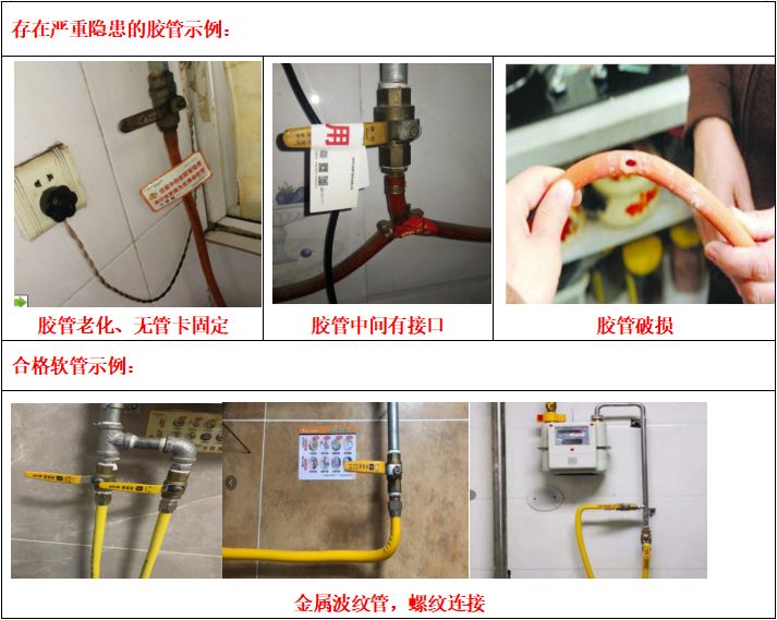 重点检查灶具、热水器连接管及连接管两端接口,如有过长、老化、破损、鼠咬现象,请及时更换。特别提醒:连接管两端必须有管夹固定或螺纹紧固,防止脱落。