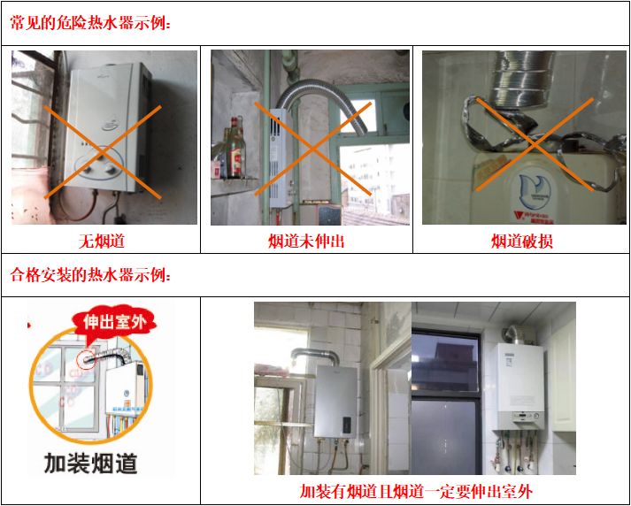检查燃气热水器是否安装有烟道管、烟道管是否破损、烟道管是否有效伸出室外。如果热水器有上述问题,就是不合格燃气具,建议及时整改或更换。另外,灶具、热水器等燃气具的使用年限是八年,超过八年,应及时更换。